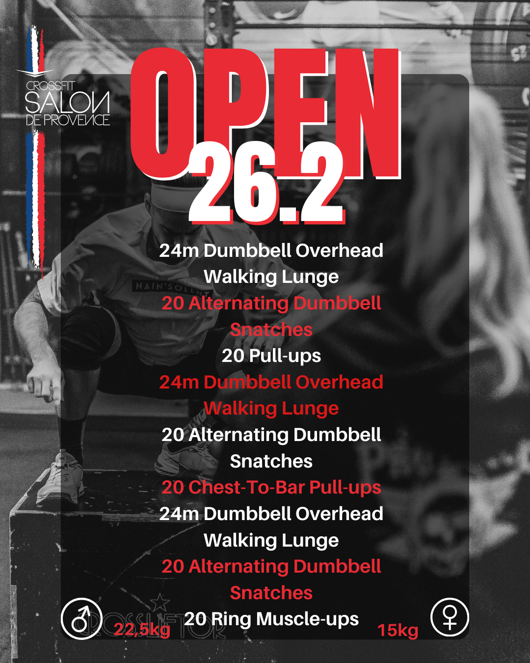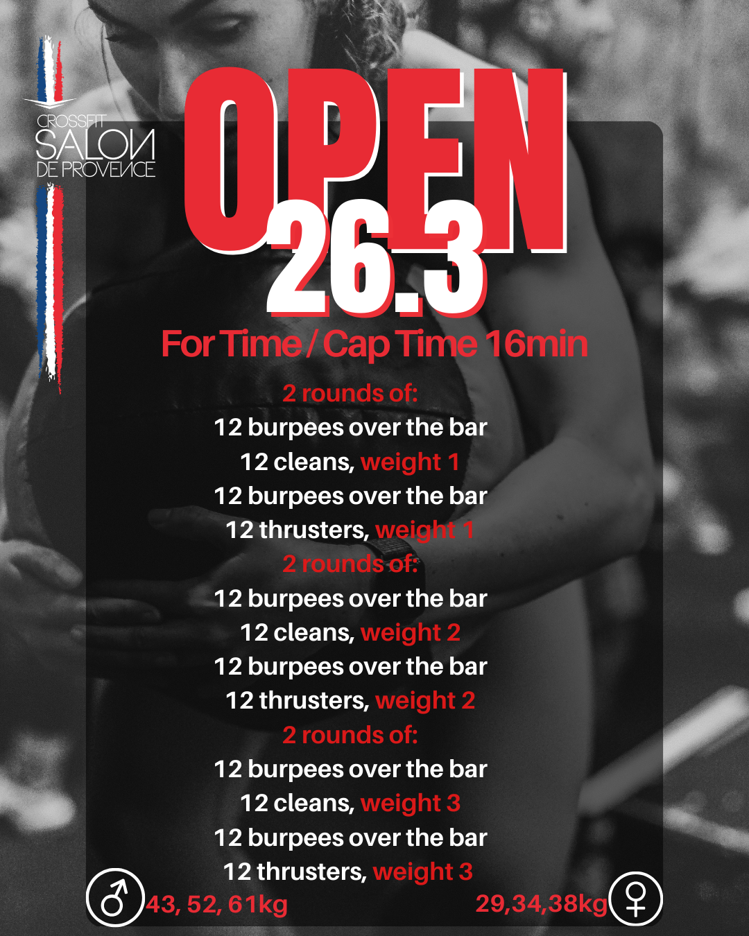 Charges RX Hommes: 43, 52, 61kg / Charges RX Femmes: 29,34, 38kg