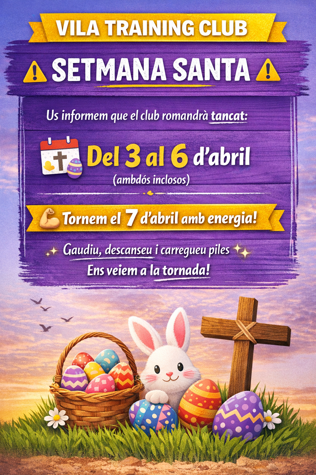 Us informem que amb motiu de Setmana Santa, el Vila Training Club romandrà tancat del 3 al 6 d’abril (ambdós inclosos).