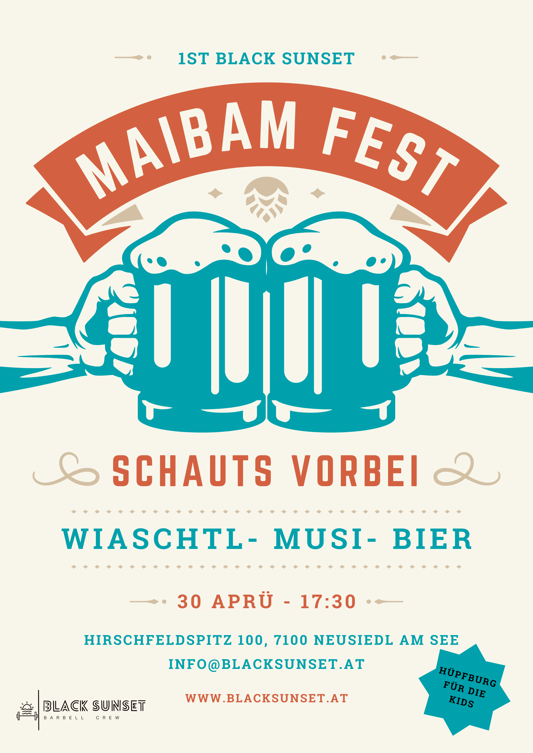Erstmals stellen wir einen kleinen Maibaum auf und veranstalten eine kleine Feier mit Drinks & Wiaschtl. Für die Kids besorge ich eine Hüpfburg! Es wird eine öffentliche Veranstaltung, also könnt ihr gerne Freunde einladen mitzukommen!
