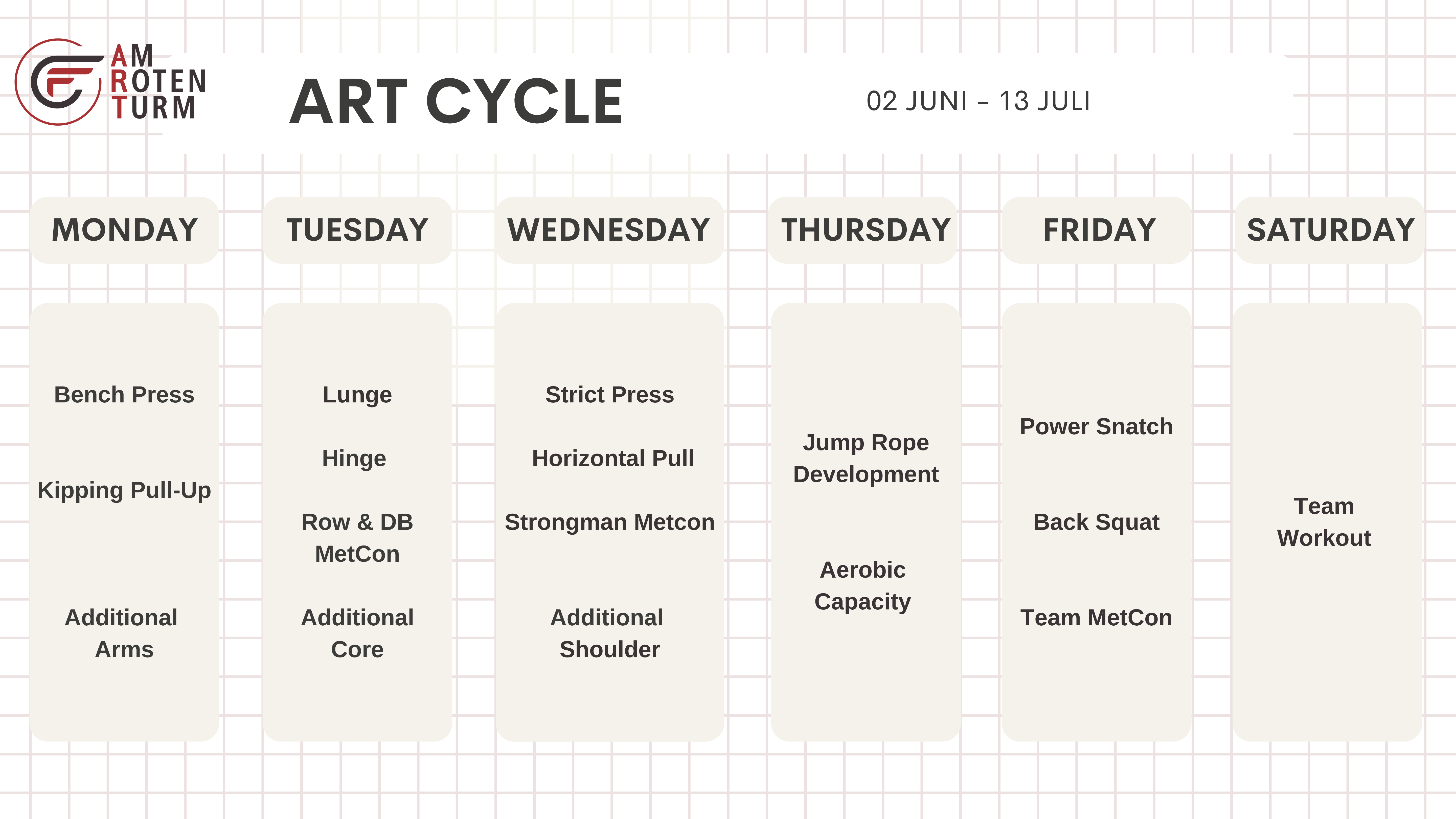hier findet ihr die Übersicht für den aktuellen Cycle. So habt ihr jederzeit die Möglichkeit nachzuschauen, was der Fokus des Tages ist und euch optimal auf die Sessions vorzubereiten oder euer zusätzliches Training drumherum passend zu gestalten.