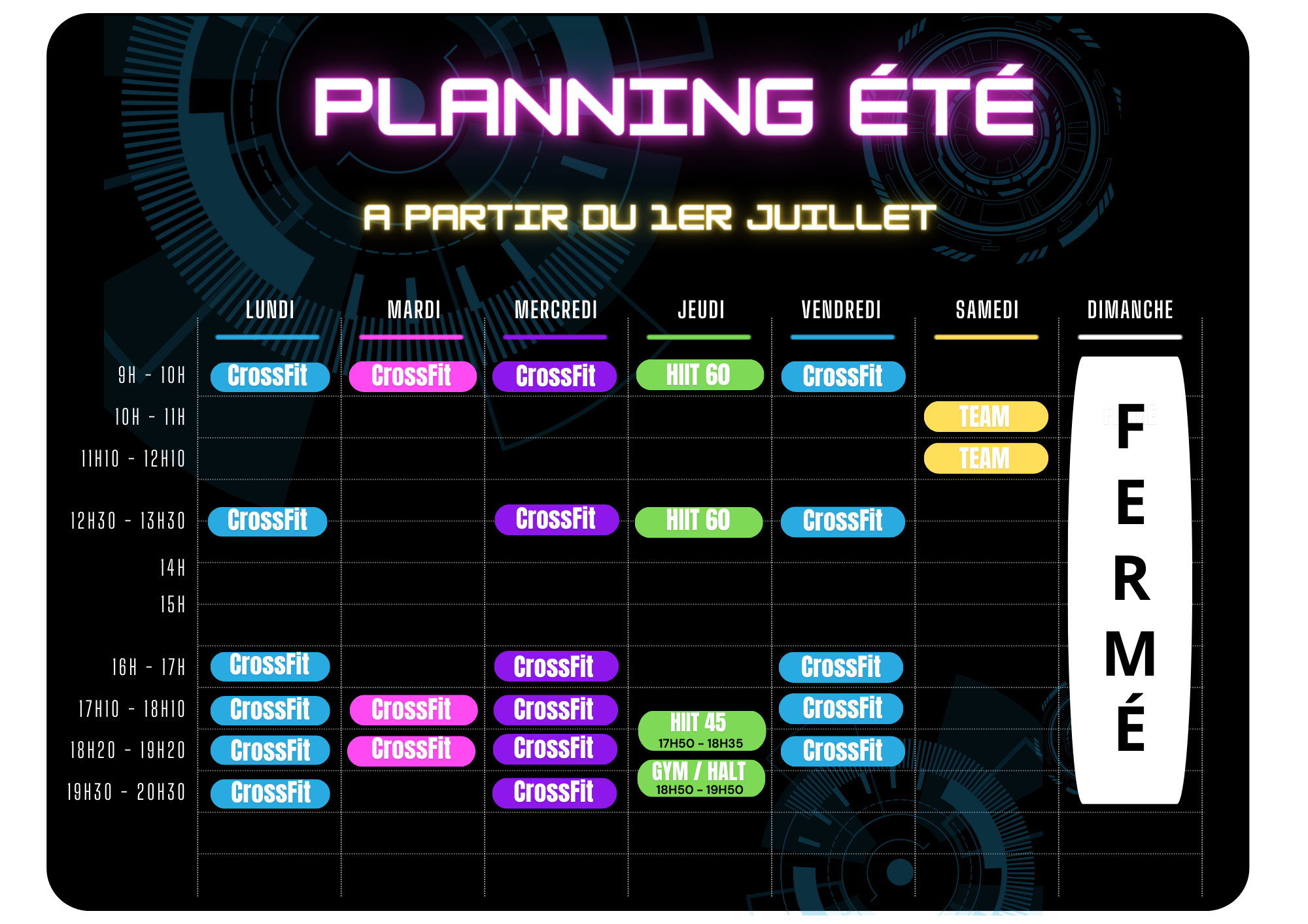 À partir du 1er juillet, petit changement d’horaires pour la période estivale avec l’arrivée d’un nouveau HIIT 60 le jeudi à 12h30 et les cours de l'après-midi remaniés.