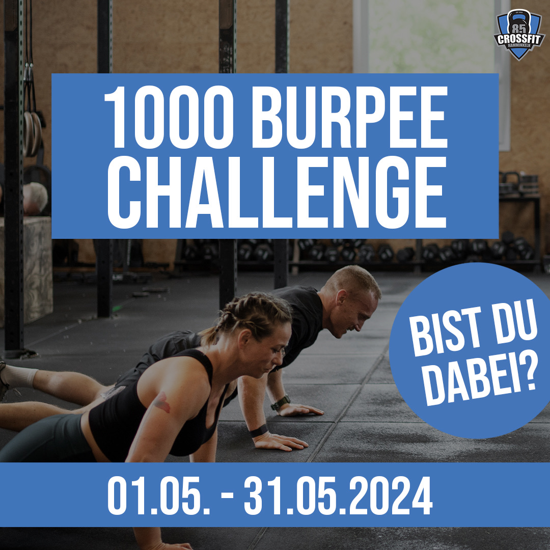 Deine Aufgabe ist ganz simpel: Absolviere 1000 Burpees (zu hause oder in der Box) im Zeitraum vom. 01.05. bis 31.05.2024 und nehme an unserer großen Verlosung teil. Unter allen Membern, die 1000 Burpees im Zeitraum vom. 01.05. 31.05.2024 schaffen, verlosen wir einen FREIMONAT :)