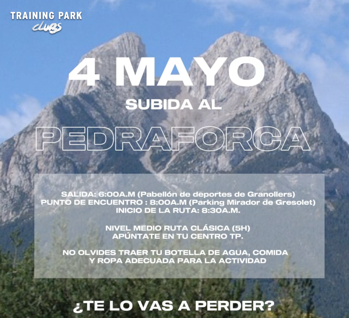 Ens encantaria compartir un matí amb vosaltres envoltats de muntanya, moviment i bon rotllo, així que us proposem pujar al Pedraforca tots junts el dissabte 4 de maig. Per fer una previsió de quants serem us demanem que comuniqueu a qualsevol dels Trainers la vostra assistència. A continuació us deixem la convocatòria: